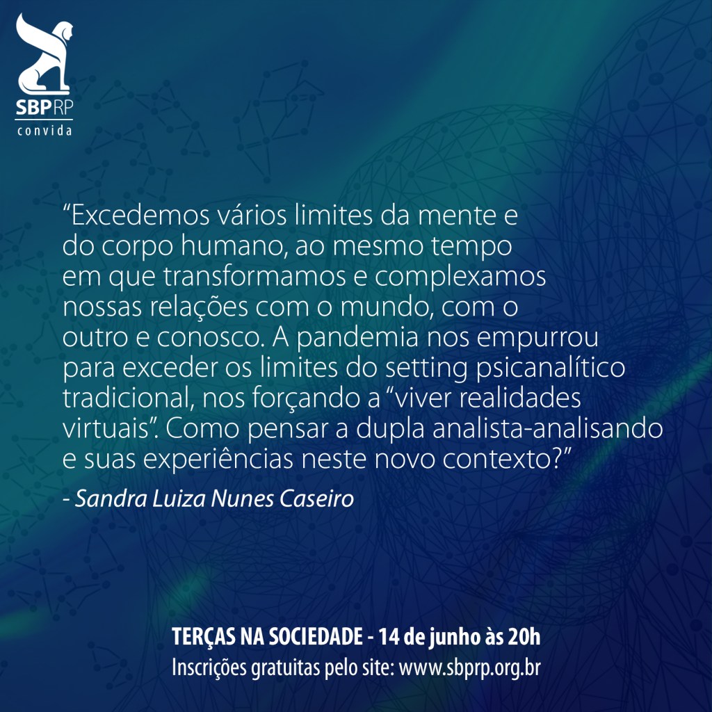 A reflexão da psicanalista Sandra Luiza Nunes Caseiro instiga a curiosidade e vem como convite para o próximo Terças na Sociedade. O debate será sobre o tema “Admirável mundo novo: a vida entre o presencial e o virtual” e acontecerá no dia 14 de junho, às 20h.