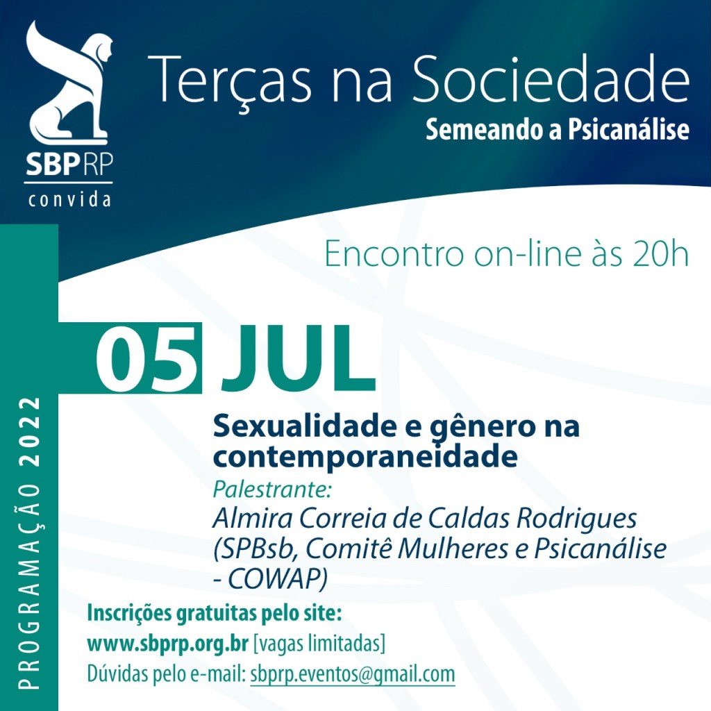 No próximo dia 5 de julho, às 20h, a SBPRP realizará mais uma edição do “Terças na Sociedade – Semeando a Psicanálise”.