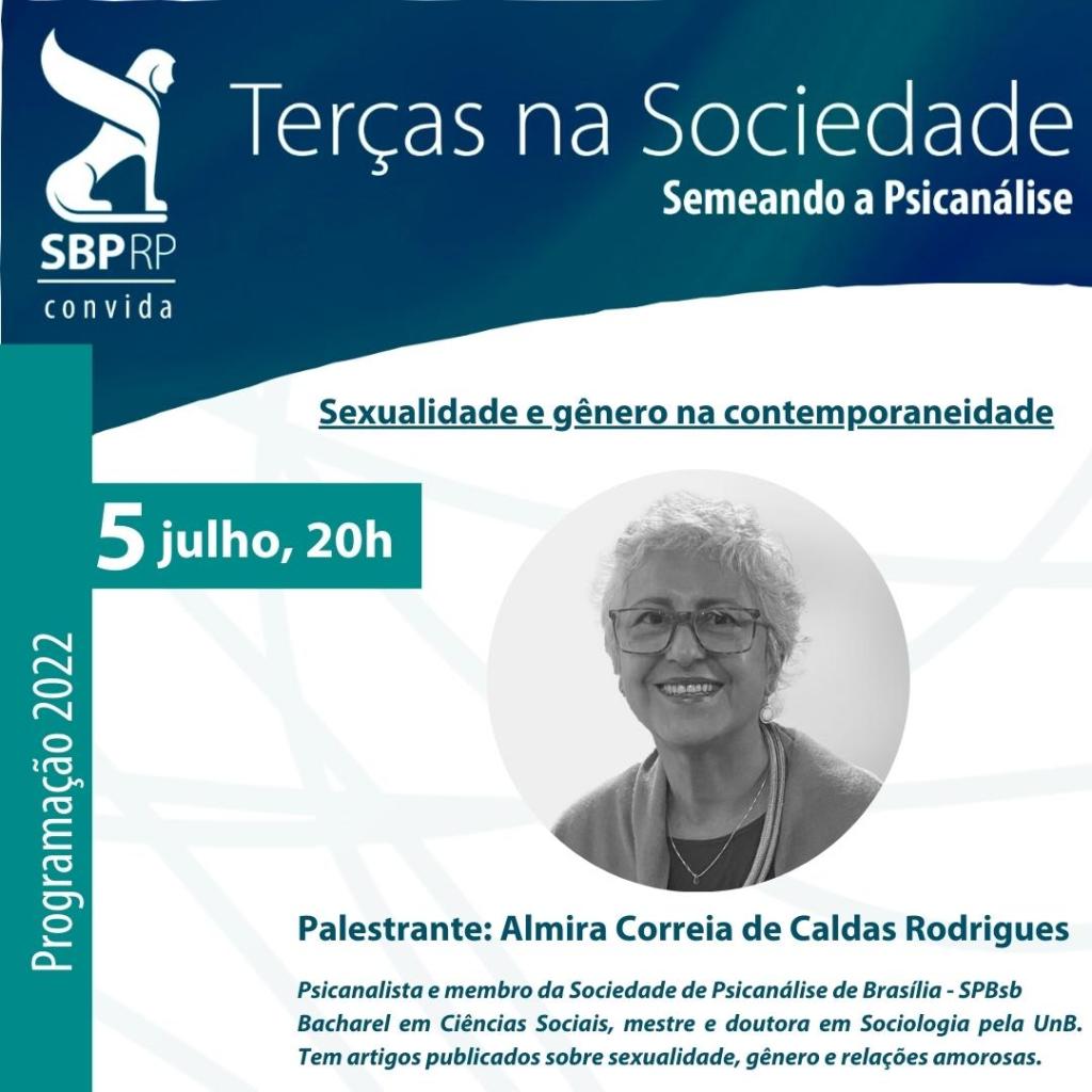 Quem capitaneará o debate será Almira Correia de Caldas Rodrigues, que tem um currículo de peso nesse tema: Almira Rodrigues é psicanalista e membro da Sociedade de Psicanálise de Brasília – SPBsb. É professora assistente do Instituto de Psicanálise Virginia Leone Bicudo – SPBsb. Também é membro de enlace do Comitê Mulheres e Psicanálise/Cowap junto à SPBsb. É bacharel em Ciências Sociais, mestre e doutora em Sociologia pela UnB – Universidade de Brasília. Tem artigos publicados sobre sexualidade, gênero e relações amorosas.
