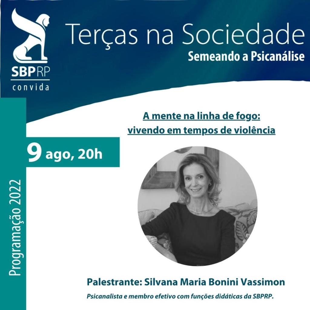 No dia 09 de agosto, às 20h, acontecerá o próximo Terças na Sociedade. Desta vez contaremos com a participação da psicanalista Silvana Maria Bonini Vassimon, membro efetivo com funções didáticas da SBPRP, que falará sobre o tema “A MENTE NA LINHA DE FOGO: VIVENDO EM TEMPOS DE VIOLÊNCIA”.