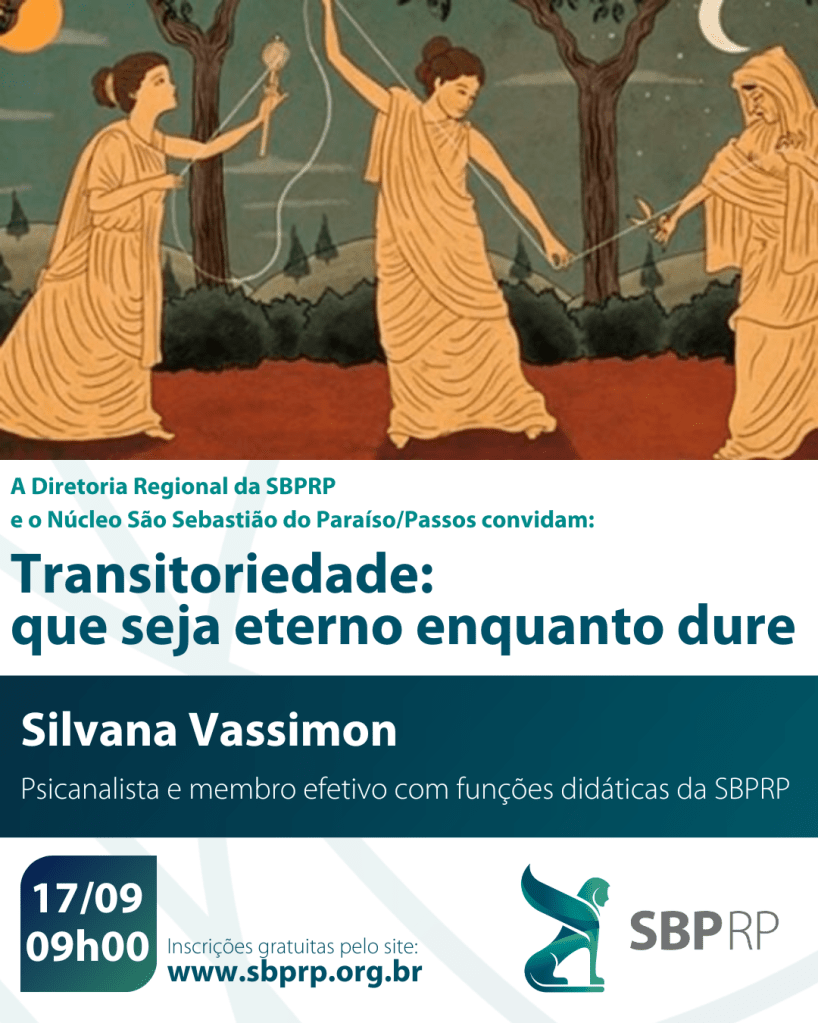 A Diretoria de Cultura e Comunidade e a Secretaria Regional da SBPRP, convidam você de diferentes áreas: humanas, exatas, saúde, comunidade em geral, interessados em conversar conosco sobre A Transitoriedade. O que é o momento? E o tempo? E a vida? Tantas e tantas vezes nos perguntamos isso! As perdas, inevitáveis, e de qualquer tipo, são condições de vida. Falar sobre o Trânsito, a Passagem, o Efêmero, é falar sobre a Vida e a Morte. Dupla inseparável na qual uma ganha sentido apenas em presença da outra. Não há movimento, caminhar ou desenvolvimento sem deixar algo, ou alguém, para trás. O fim, limite inevitável, nos assombra, mas também confere sentido a nossa vida. Tema difícil, sofrido, posto que nos obrigada a enfrentar uma realidade que nos escapa ao controle, nos confronta com o terror e com a nossa impotência. No entanto, é preciso falar, esmiuçar, conhecer profundamente este tema, posto que isto, ainda que não nos conceda poderes mágicos, pelo menos nos liberta de naufragar no luto e no sofrimento infindáveis.”