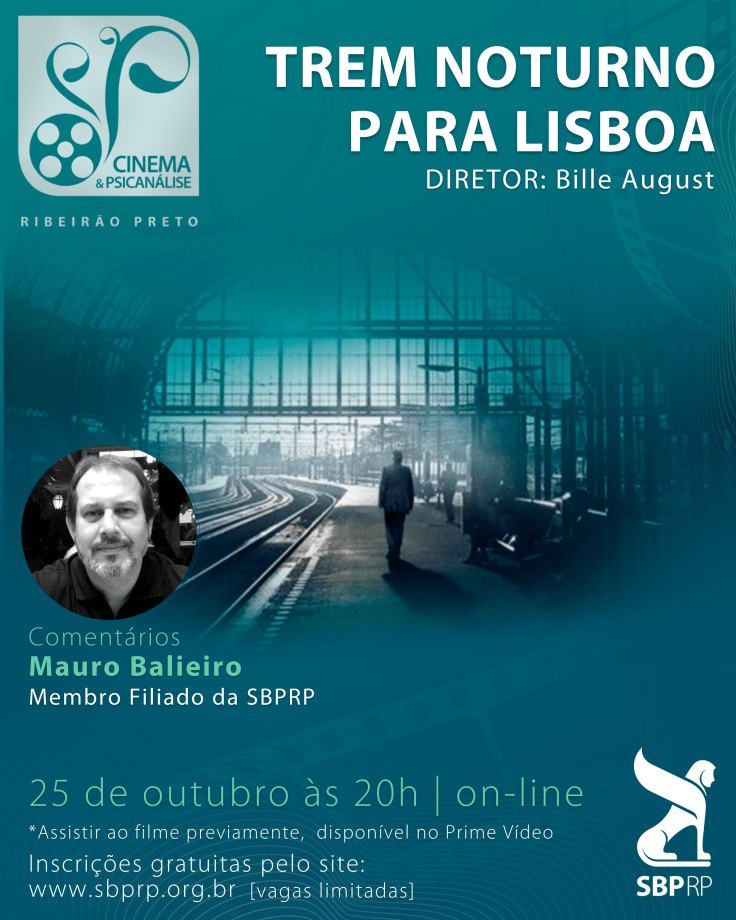 O próximo Cinema & Psicanálise de Ribeirão Preto contará com a presença de Mauro C Balieiro, Membro Filiado da SBPRP, que comentará sobre o filme “Trem noturno para Lisboa” (“Night train to Lisbon”) do diretor Bille August. O encontro acontecerá no dia 25 de outubro, às 20h, pela plataforma Zoom.