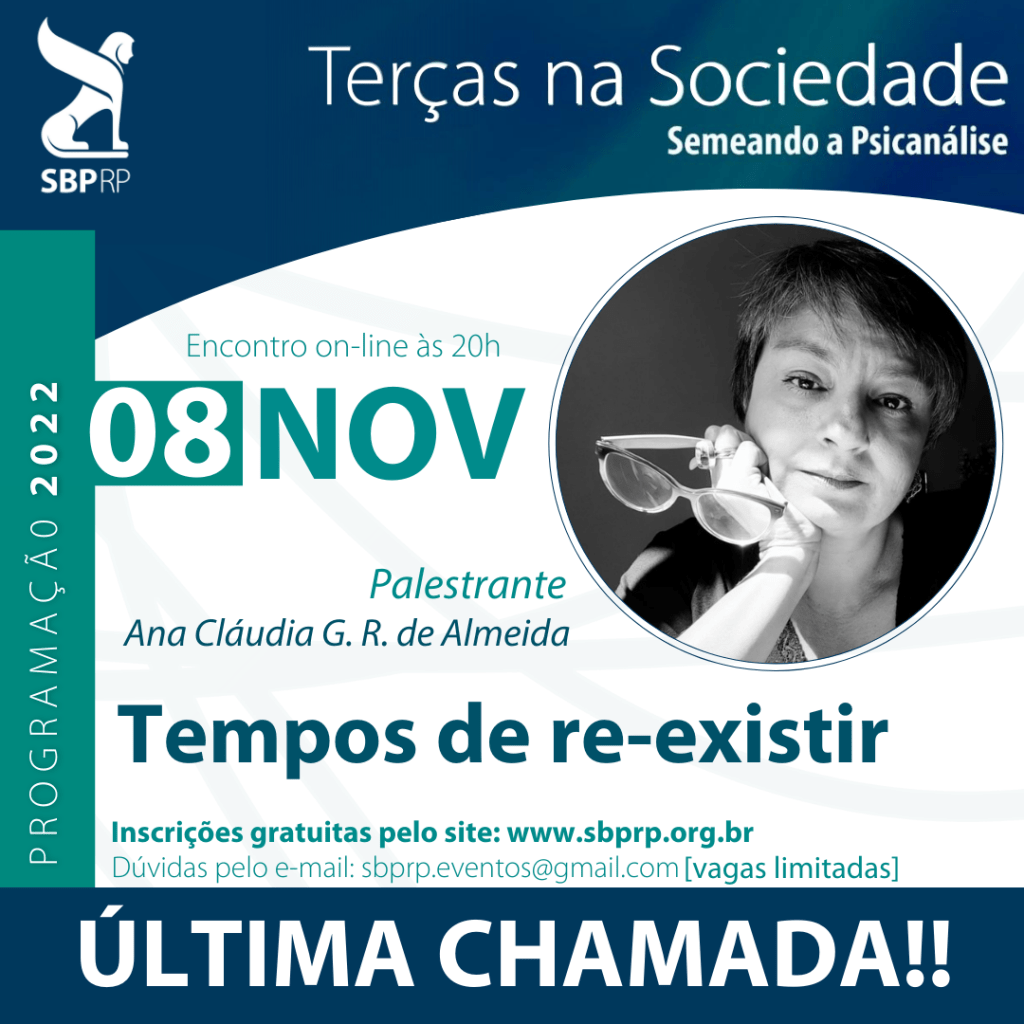 Ao longo do ano de 2022 o projeto Terças na Sociedade da SBPRP discutiu sobre os desafios de nosso tempo, luto e luta, pandemia, sobrevivência, violência, desigualdades e fakenews. Sustentando o compromisso ético da Psicanálise, procurando, sempre, ser um espaço para o pensar, para a lucidez, a humanidade e humanização.