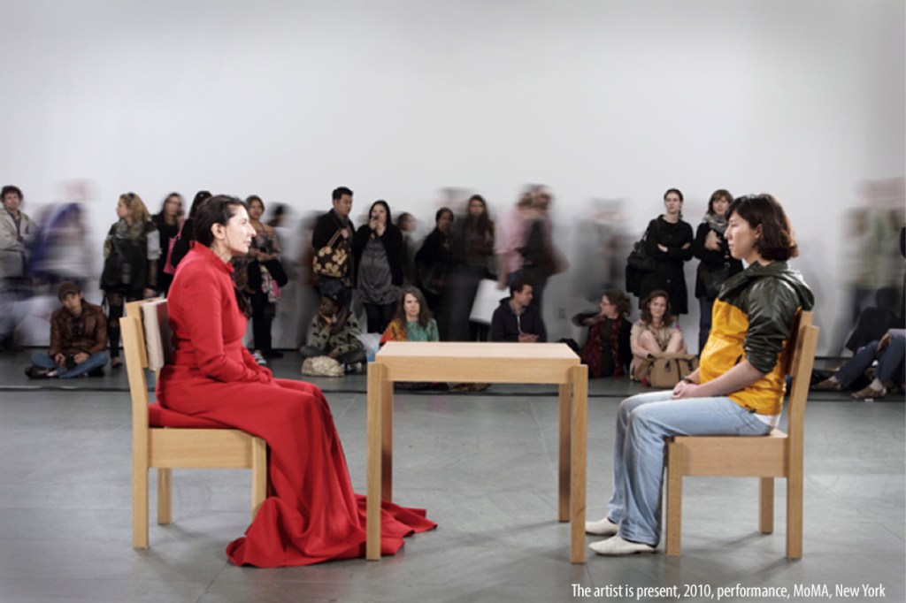 Foi assim que, de repente, me encontrei, em um chuvoso maio de 2010, adentrando uma das salas do MOMA e deparando-me com a performance The artist is present, da artista sérvia Marina Abramovic expondo-se à multiplicidade do olhar do outro de maneira que, refletido no corpo da artista, esse outro possa se ver, sentir emoções pertinentes à complexidade que o constitui, sonhar, se pensar singular e múltiplo.