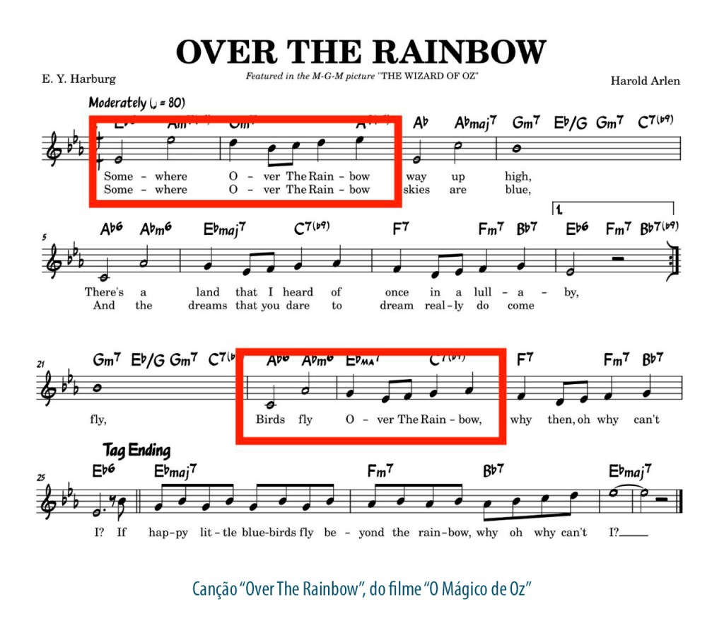 Inclusive, na trilha sonora do filme “O Mágico de Oz” esse aspecto também pode ser observado: os pequenos círculos que representam as notas musicais sobem e descem num padrão que se repete em dois momentos da música (assinalados em vermelho), porém, no primeiro, as notas se encontram nas linhas de cima – mais agudas – enquanto no segundo elas se encontram nas linhas de baixo – mais graves.